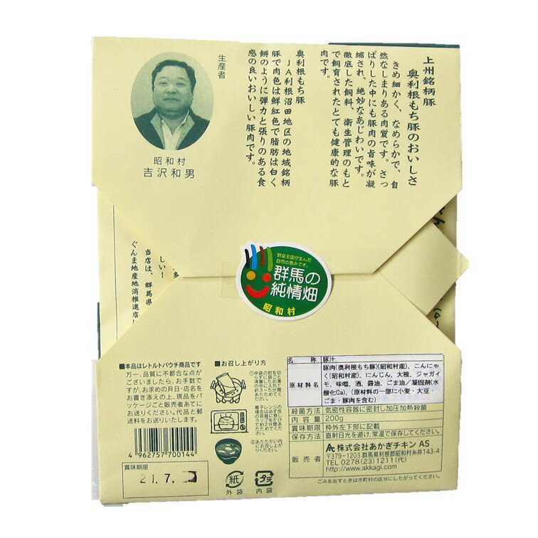 商品情報 名称 豚汁原材料名 豚肉(奥利根もち豚、昭和村産)、こんにゃく(昭和村産)、にんじん、大根、ジャガイモ、味噌、酒、醤油、ごま油、凝固剤(水酸化Ca)(原材料の一部に小麦、大豆、ごま、豚肉を含む)殺菌方法 機密性容器に密封し加圧加熱殺菌内容量 200g×10袋賞味期限 製造日から1年保存方法 直射日光を避け、常温で保存してください。