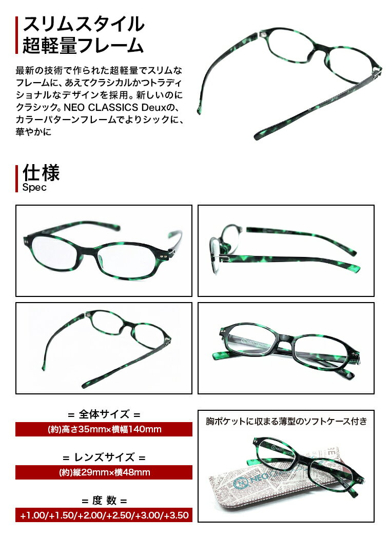 老眼鏡 レディース おしゃれ スリムスタイル 超軽量フレーム GLR-11NEO CLASSICS Deux 老眼鏡 シニアグラス・最新の技術で作られた超軽量でスリムなフレーム・あえてクラシカルかつ、トラディショナルなデザインを採用・超弾性樹脂により、しなやかな掛け心地を実現 商品詳細■カラー:グリーン(COLOR4)、ステンド(COLOR7)、ブラウンデミ(COLOR8)■サイズ:レンズサイズ: 約29×48(mm)全体サイズ縦×横:約35×140(mm)テンプルの長さ:135mm■度数:+1.00〜+3.50■注意事項メーカー取り寄せ。
