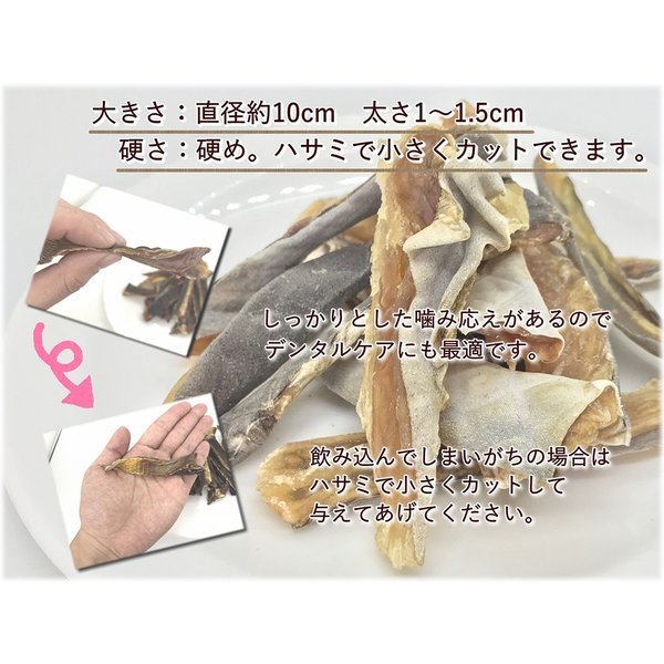 淡路島近海及び日本国内で水揚げされる天然のサメ(トチザメ・シロザメ等)を愛犬用にカットし、サメ特有のアンモニア臭を消す独自の技術「無菌の軟水」にさらし、水分を飛ばしたのち、ミネラルを含んだ潮風で乾燥させて天日干しで仕上げ、アミノ酸たっぷりの犬のおやつに仕上げました。